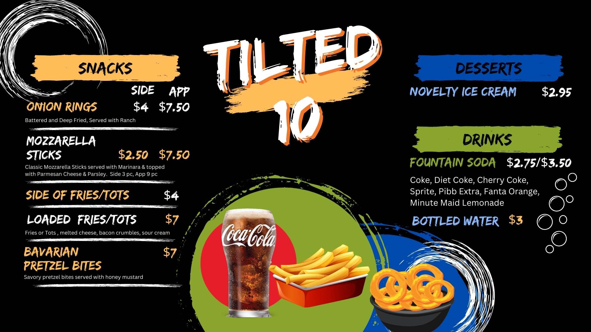 Come dine with us and experience a unique and fun food selection. Fan favorites include pretzel bites, cake pops, and mozzarella sticks.